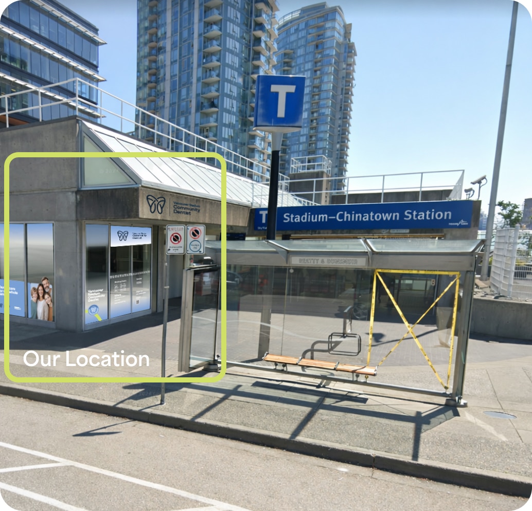 Vancouver Stadium Community Dentist located in Downtown Vancouver’s Stadium–Chinatown area, near BC Place and Rogers Arena, is easy to reach by SkyTrain and nearby transit routes.